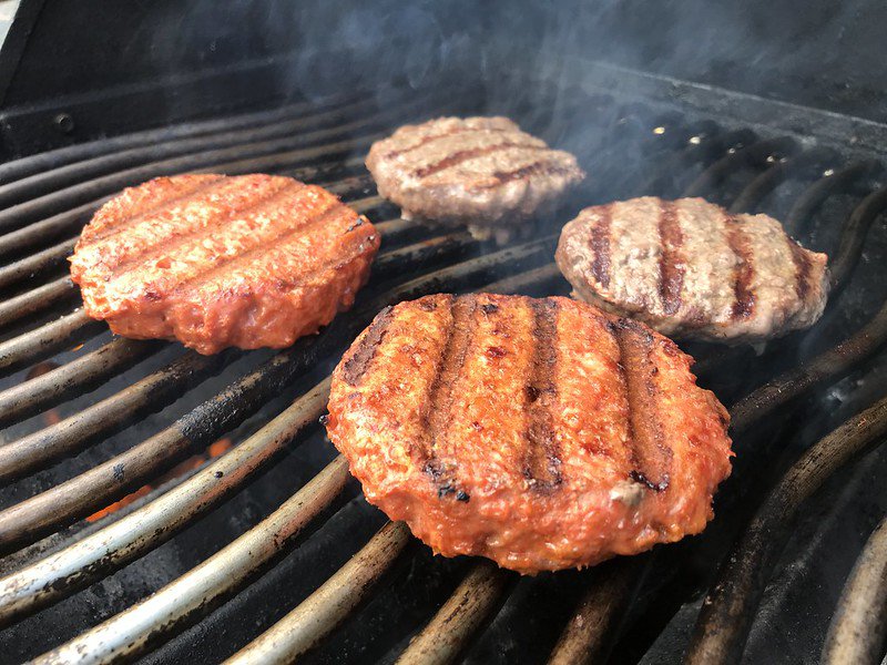 Beyond Burger (foreground) cooking on the grill alongside beef burgers.
